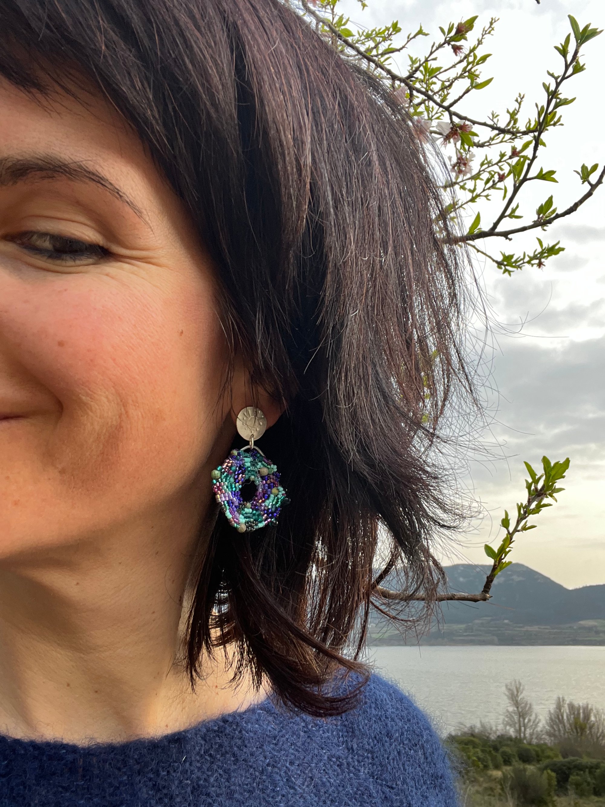 Perles de verres japonaises et tchèques tissées et montées sur attaches et anneaux en argent massif entièrement façonnés à la main